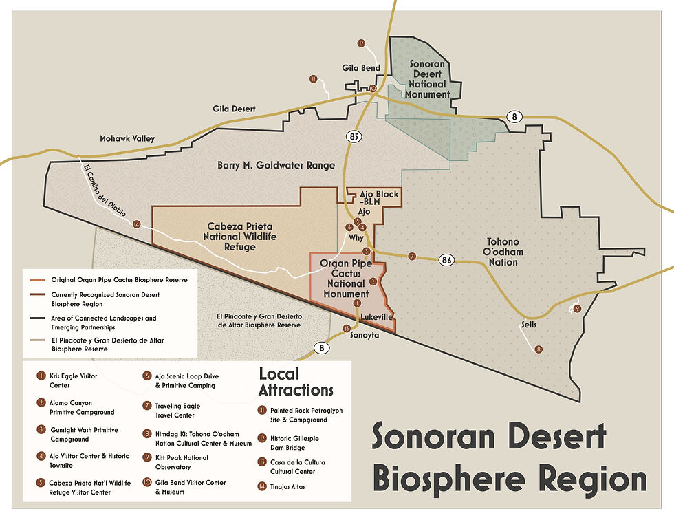 Today, the biosphere concept has expanded to include nearby public lands and communities like Ajo, Why, and Lukeville, creating a collaborative region focused on conservation and sustainable development.